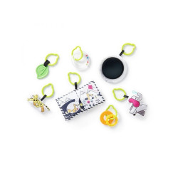 Include 7 giocattoli di diversi valori cognitivi ed estetici: specchio, libro frusciante, 2 mascelle, sonaglio, tigre che stride e elefante che squilla