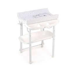 Previjalna miza s sistemom proti nagibanju, opremljena s kadjo Baby Bagno z dvema anatomsko oblikovanima, nedrsečima sedežema (enim nagibnim za dojenčke, stare od 0 do 6 mesecev, in drugim z naslonjali za roke za dojenčke, stare od 6 do 12 mesecev). Držala za milo in gobice, majhna prha, odtočni čep in cev, predal z držalom za stekleničko, 4 kolesca (2 z...