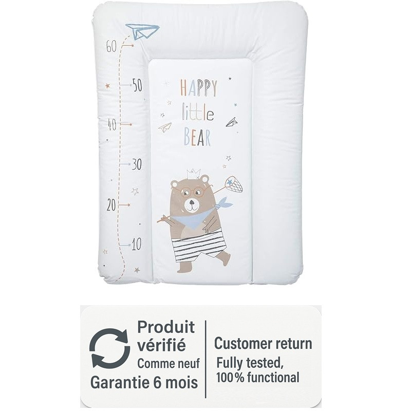 BABYCALIN Essentiel Happy Little Bear skötunderlägg (50x70 cm) kombinerar hygien och komfort. Dess 100% vattentäta PVC-yta är lätt att rengöra, medan dess polyestervadd garanterar ett mjukt välkomnande. Det lilla extra: den tryckta storlekstabellen för att hålla koll på barnets tillväxt!