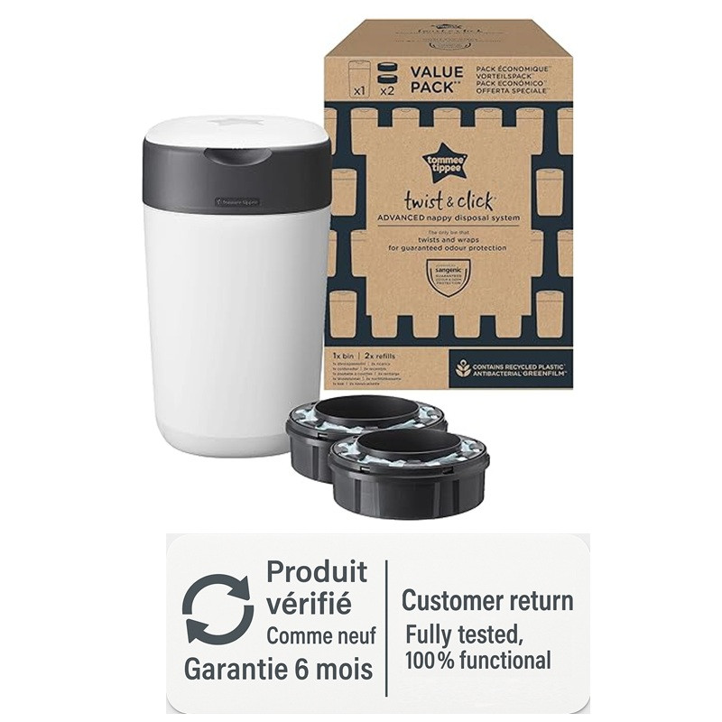 Produkt kontrollerad - Som ny - 6 månaders garanti Returnerad vara (tillbakadragande, skadad eller saknad förpackning). Testad, 100% funktionell. Säljs utan påfyllning, Tommee Tippee Twist & Click blöjkorg, stor kapacitet, anti-lukt- och anti-bakteriesystem. Säljs utan refill, refill finns att köpa separat.